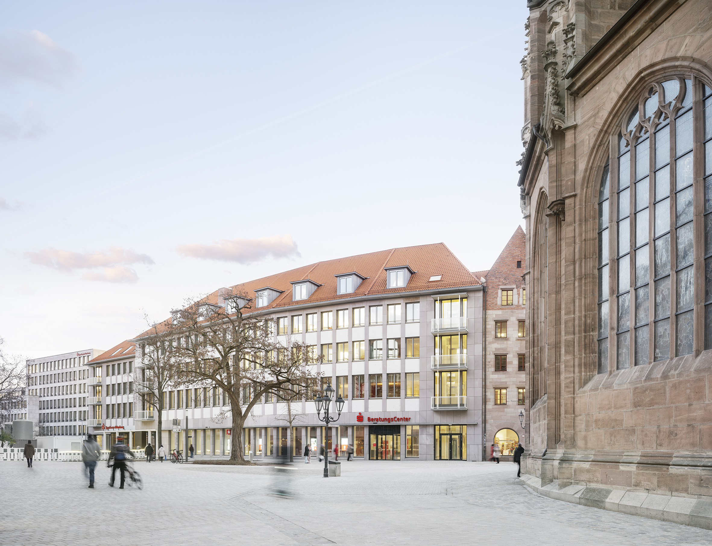 Nach Fertigstellung unseres Projektes Sparkasse Nürnberg Haus der Kunden im März 2025 konnte durch die Stadt Nürnberg im Dezember 2025 die erste Teilfläche des Lorenzer Platzes fertiggestellt werden. Wir haben die Chance genutzt und durch unseren Fotografen Werner Huthmacher aus Berlin die denkmalgerecht sanierten Fassaden in Szene setzen lassen.