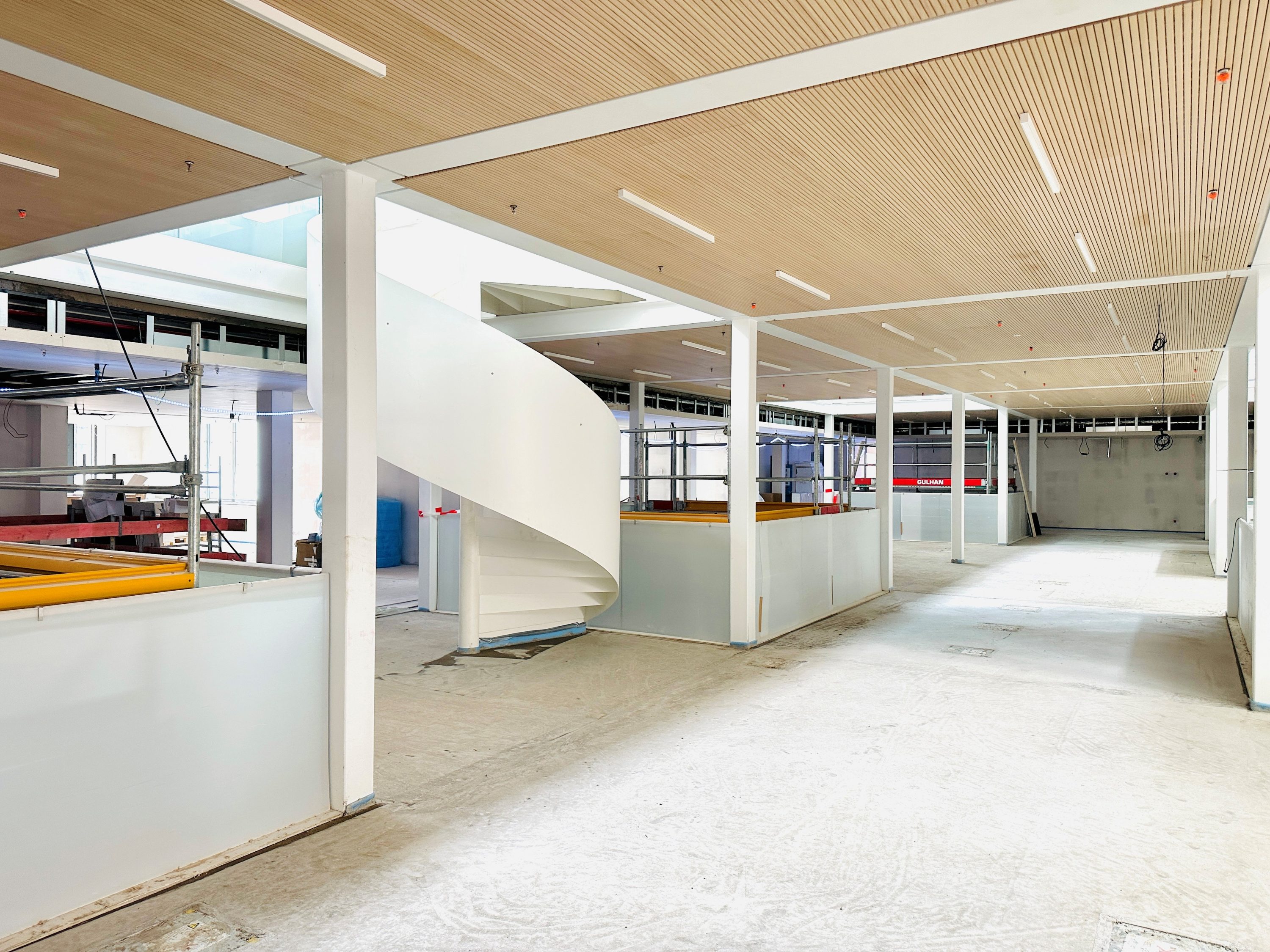Neben der neuen Fassade unseres Projektes "Haus des Kunden" der Sparkasse Nürnberg zeugt auch der fortschreitende Ausbau der Erweiterungsflächen im Bereich des ehemaligen Innenhofs des 50er Jahre Gebäudes von der Wandlung des baulichen Bestandes zu modernen Bürolandschaften.