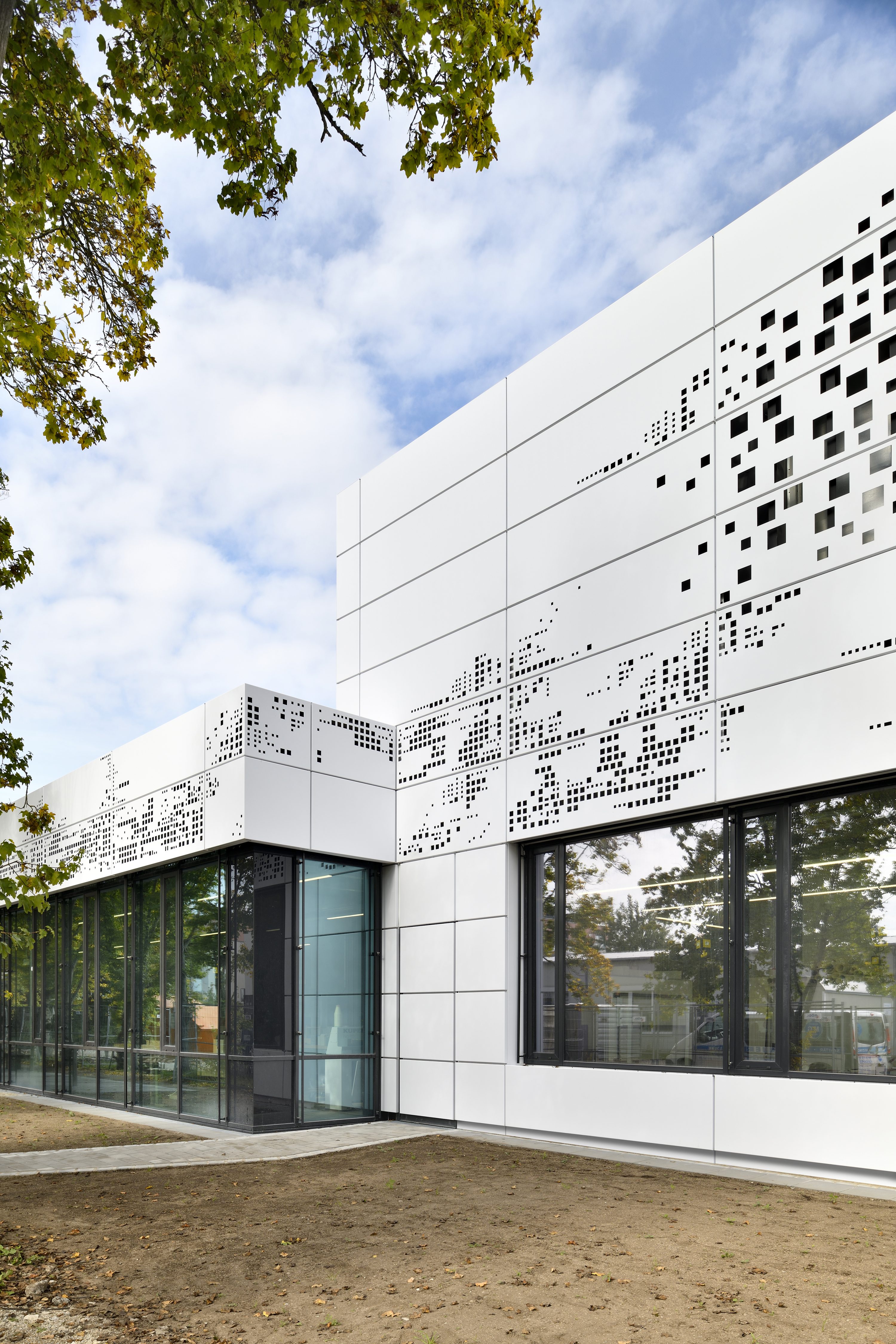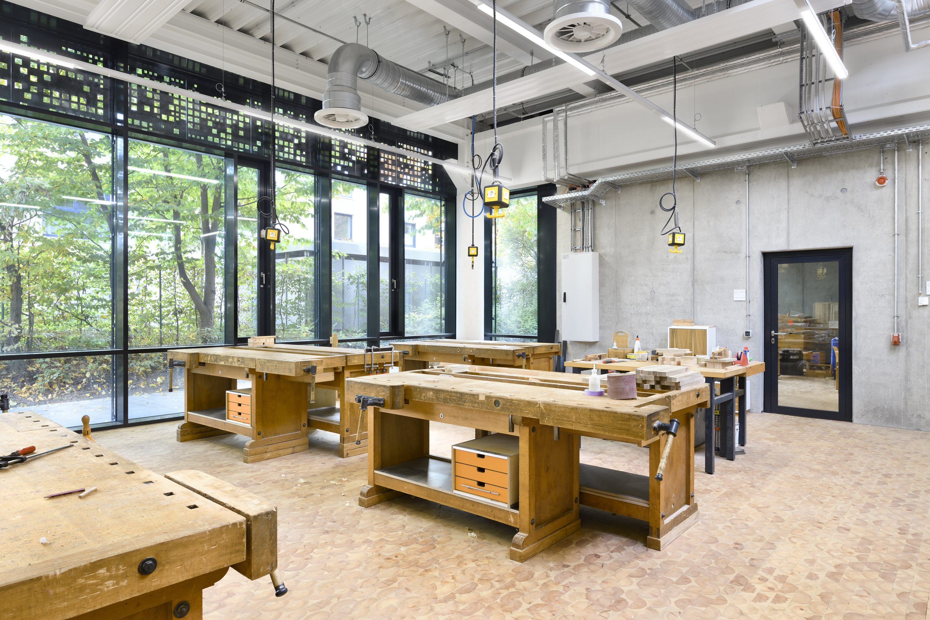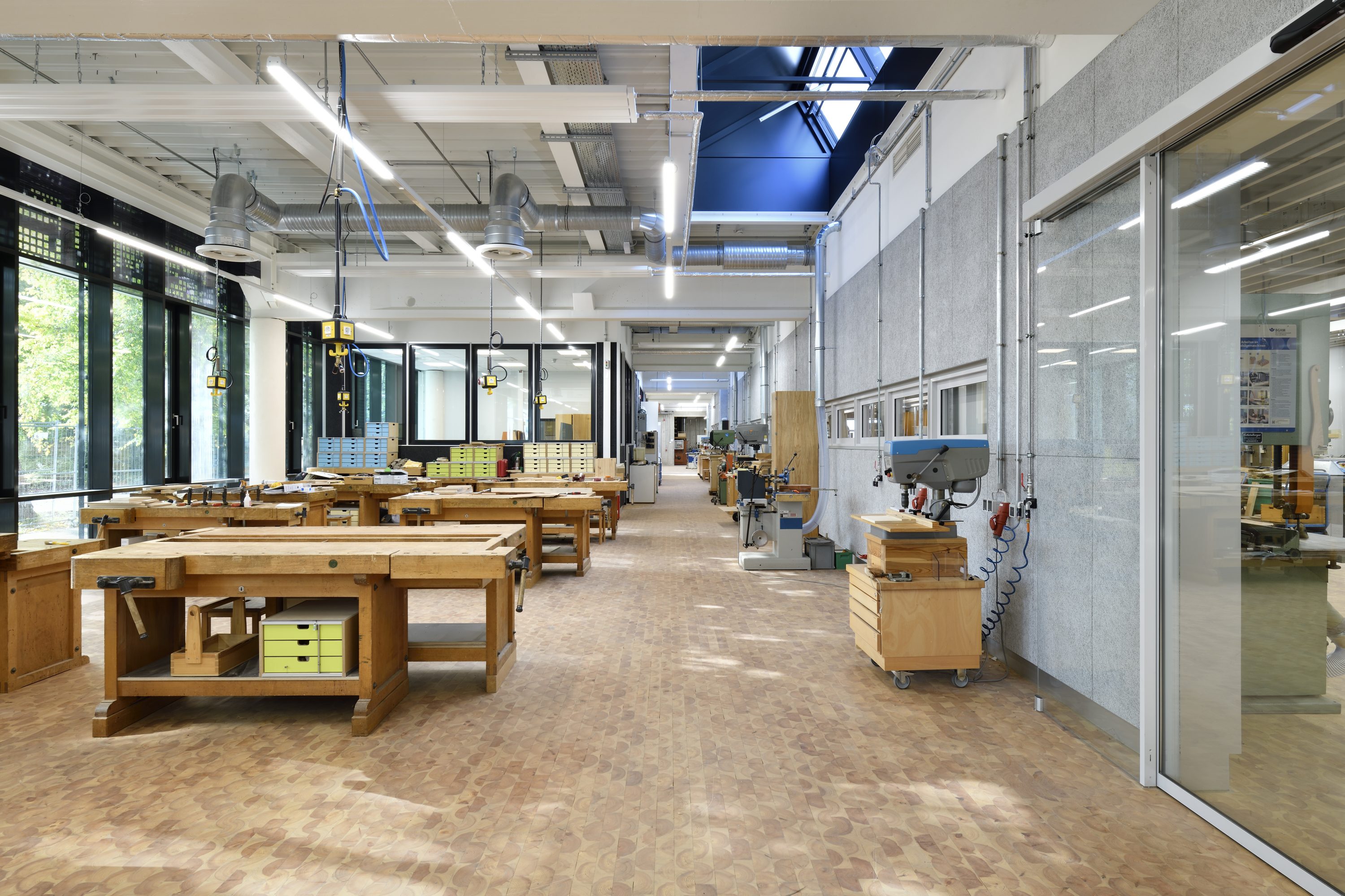Die bestehende Werkhalle für Tischlerei und Schweißerei wurde um ein Holzlager und Technikaufbauten erweitert. Die bestehende Rohbaukonstruktion wurde erhalten. Die Fassaden- und Dachflächen wurden energetisch erneuert. Zur Verbesserung des Tageslichteinfalls wurden großflächig Pfosten-Riegelkonstruktionen ergänzt, die den Außenbezug der Arbeitsplätze verbessern. Die opaken Fassadenflächen wurden mit einer vorgehängten, hinterlüfteten Verkleidung aus perforierten Aluminiumtafeln versehen.