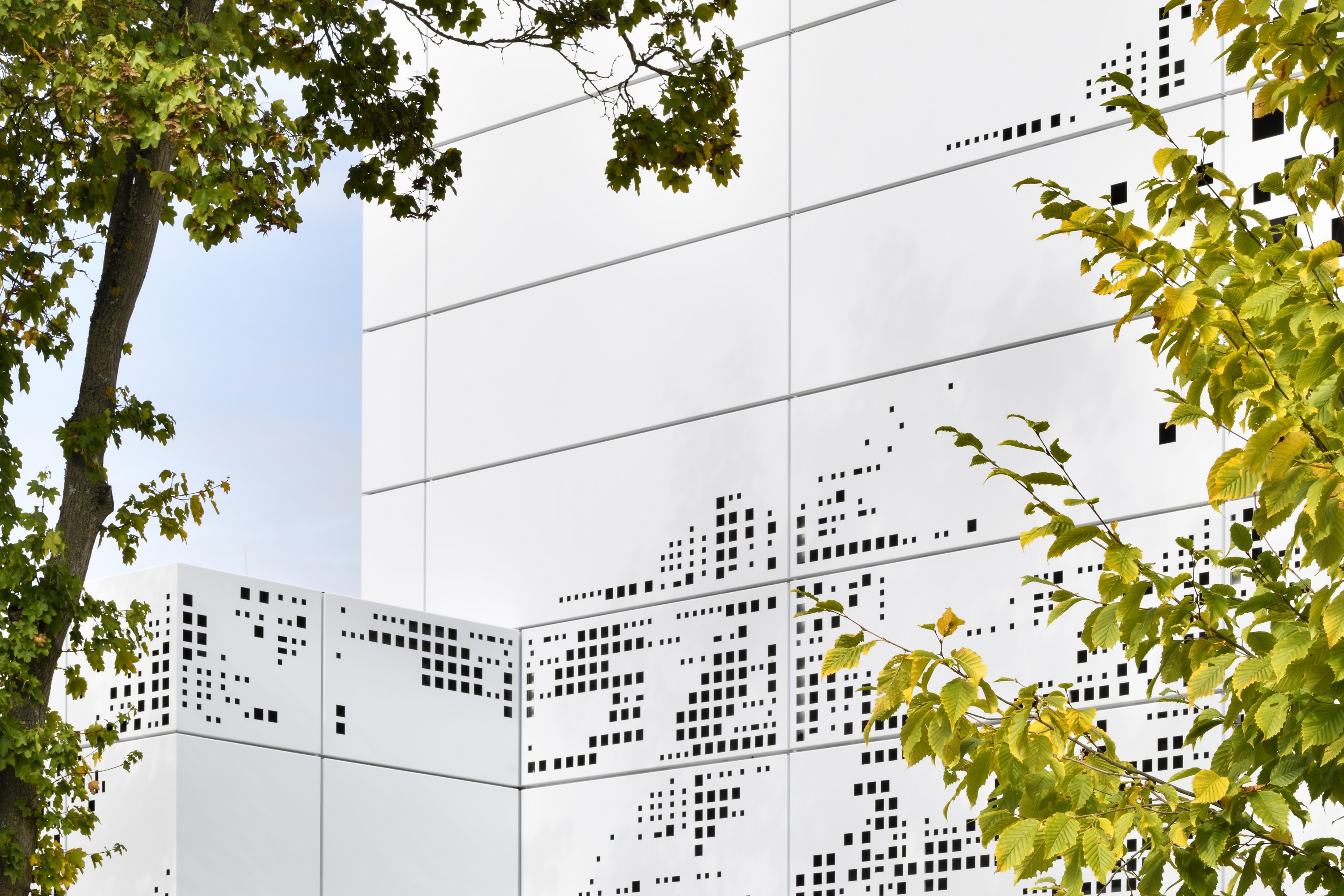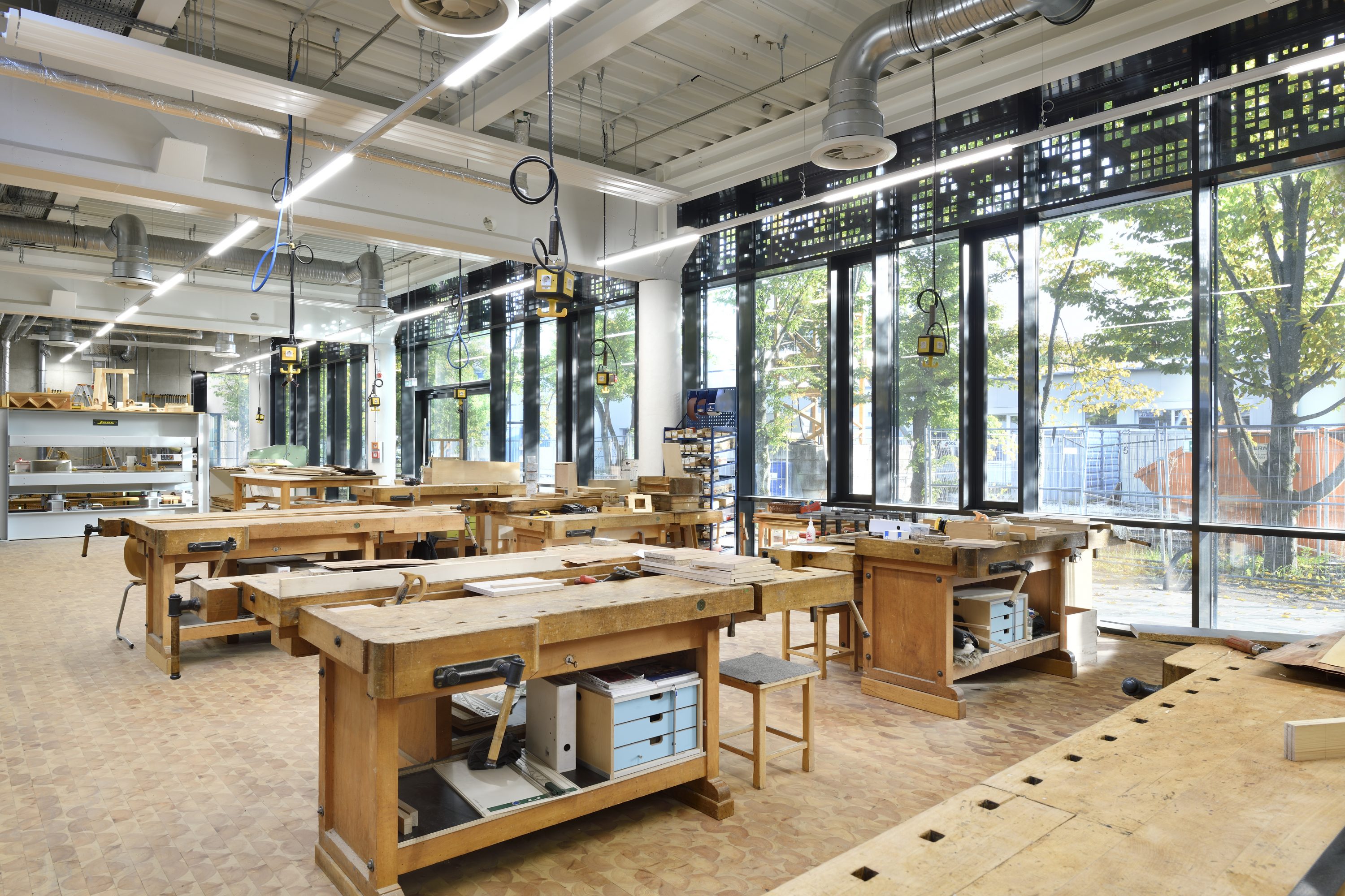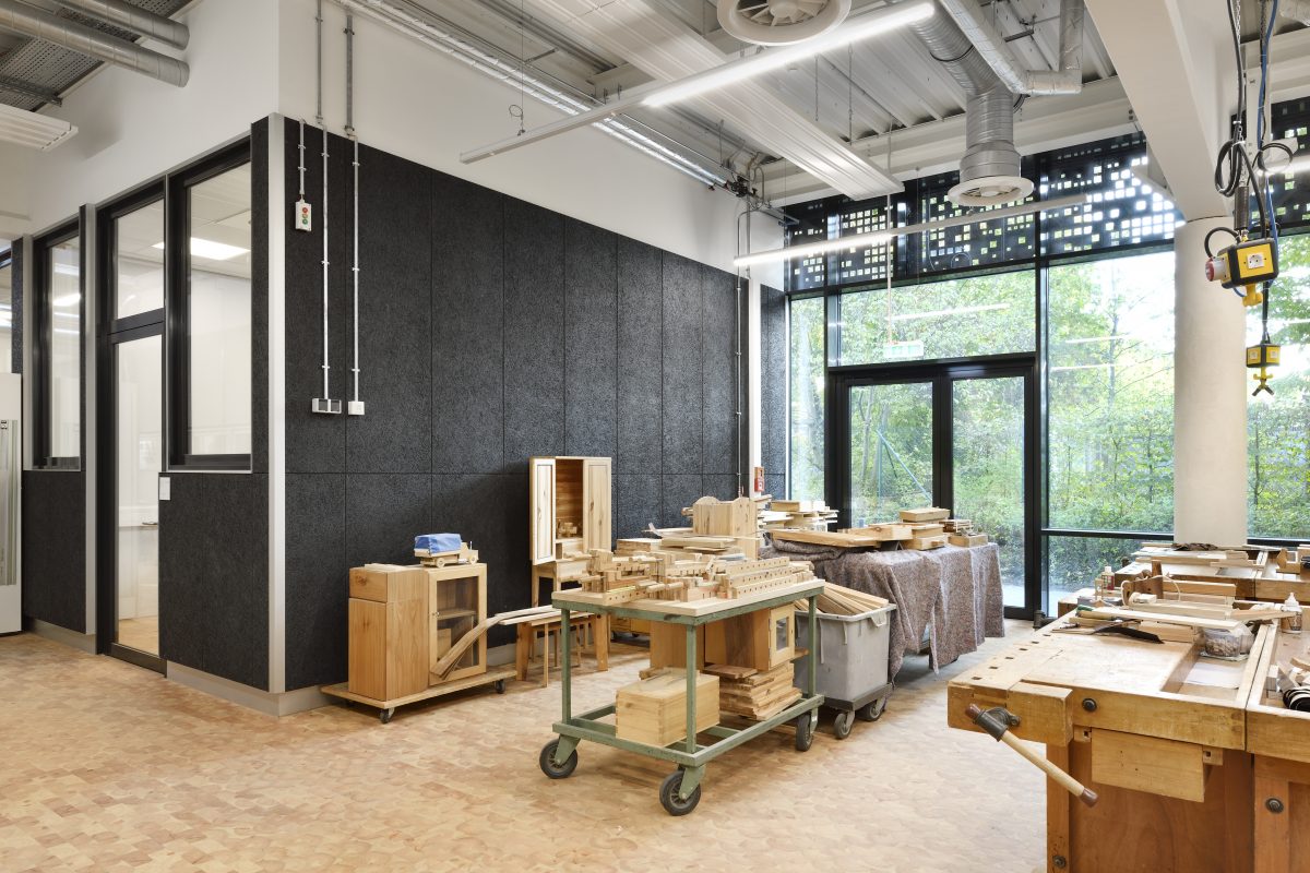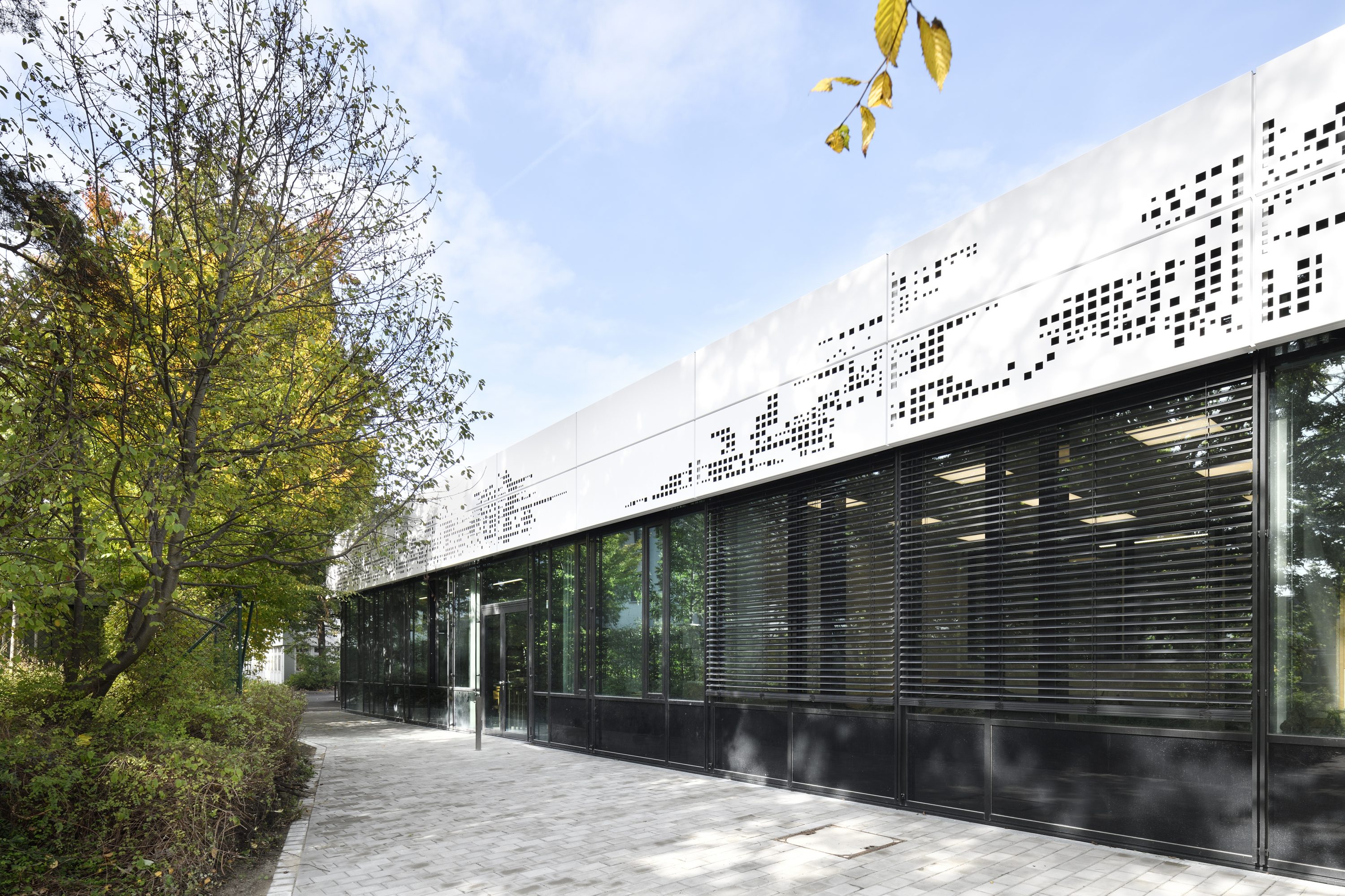 Die bestehende Werkhalle für Tischlerei und Schweißerei wurde um ein Holzlager und Technikaufbauten erweitert. Die bestehende Rohbaukonstruktion wurde erhalten. Die Fassaden- und Dachflächen wurden energetisch erneuert. Zur Verbesserung des Tageslichteinfalls wurden großflächig Pfosten-Riegelkonstruktionen ergänzt, die den Außenbezug der Arbeitsplätze verbessern. Die opaken Fassadenflächen wurden mit einer vorgehängten, hinterlüfteten Verkleidung aus perforierten Aluminiumtafeln versehen.