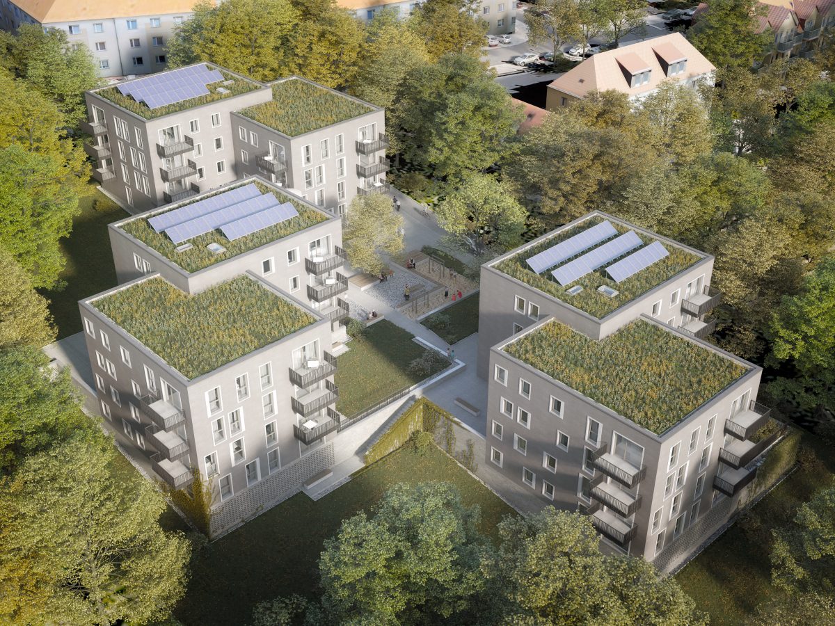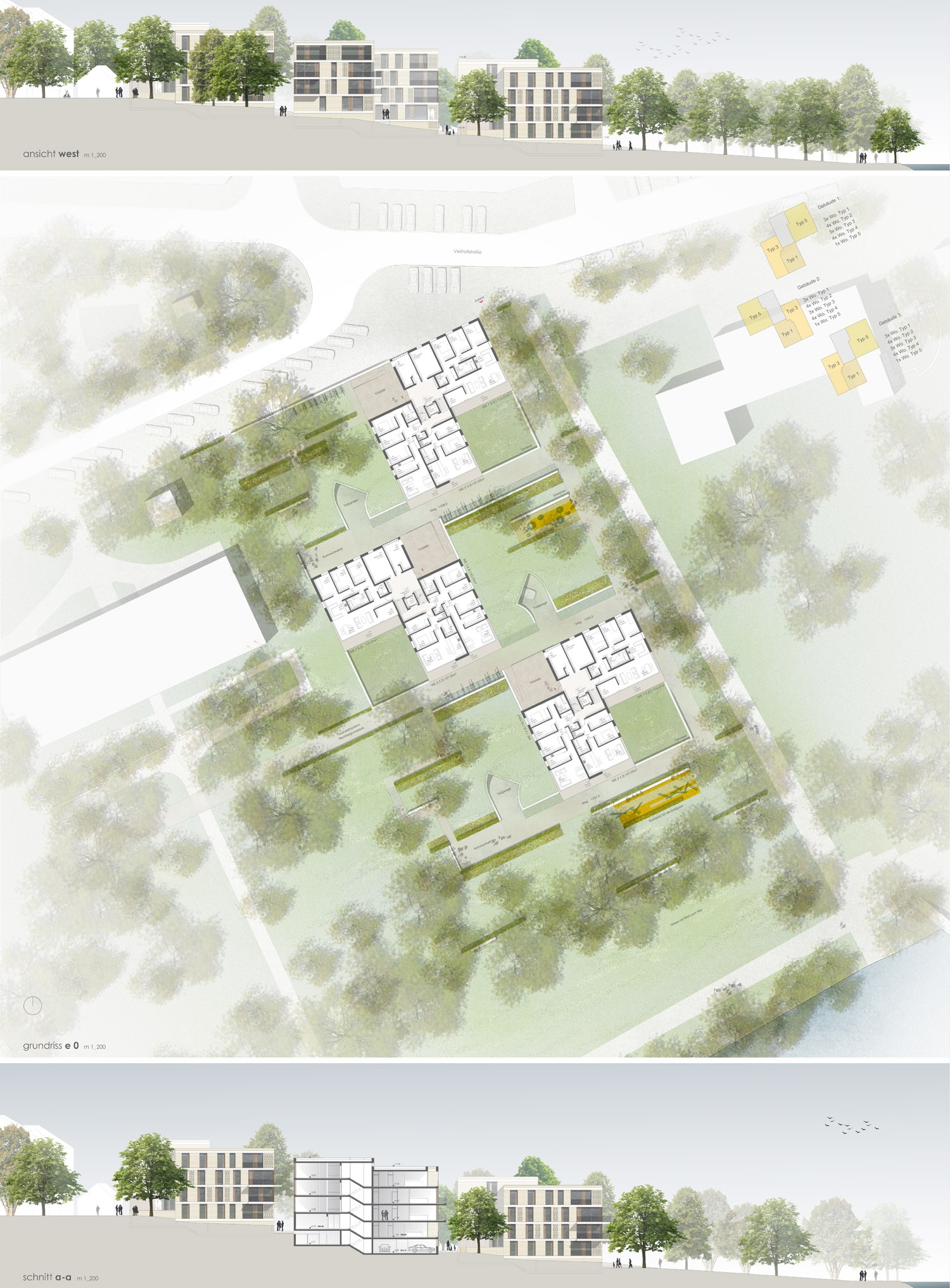 Die Baukörper sind maßstäblich gestaltet und folgen über einen halbgeschossigen Versatz (Split Level) der Geländetopografie. Dadurch entsteht eine natürliche Höhenstaffelung der Baukörper und angenehme Fassadenlängen. Der campusartige Entwurfsansatz wird durch die Implementierung der gewünschten wohnnahen Nebenfunktionen und der gestalterischen Einbeziehung des vorhandenen Baumpotenzials erreicht.