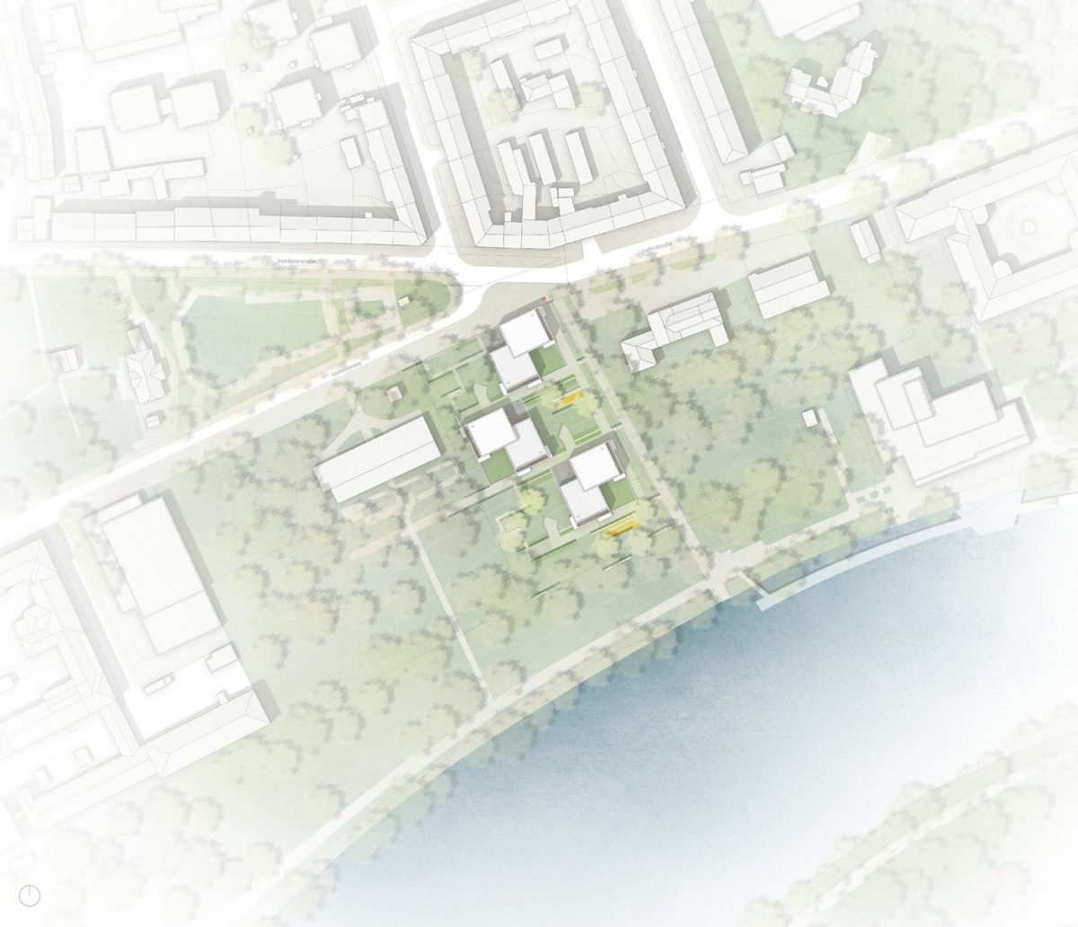 Die städtebauliche Struktur des Areals entlang der Veilhofstraße in Nürnberg ist geprägt durch einen Wechsel von Blockrandbebauungen aus der Gründerzeit und Solitärgebäuden, die sich im Grünsaum entlang des Wöhrder Sees entwickeln. Das zu bebauende Grundstück war im Bereich des Baufeldes nicht bebaut. Das Gelände ist im nord-/südlichen Verlauf stark geneigt. Wertvoller Baumbestand, der in der Umsetzung des Projektes im Sinne der Qualität des Wohnumfeldes erhalten werden sollte, schränkten die Bebaubarkeit ein. Unter Berücksichtigung dieser Vorgaben wurde das Grundstück in sechs Quadranten eingeteilt. Wechselseitig besetzen die Gebäudevolumen diese Felder und verfügen jeweils allseitig über direkte Bezüge zum Grünraum.