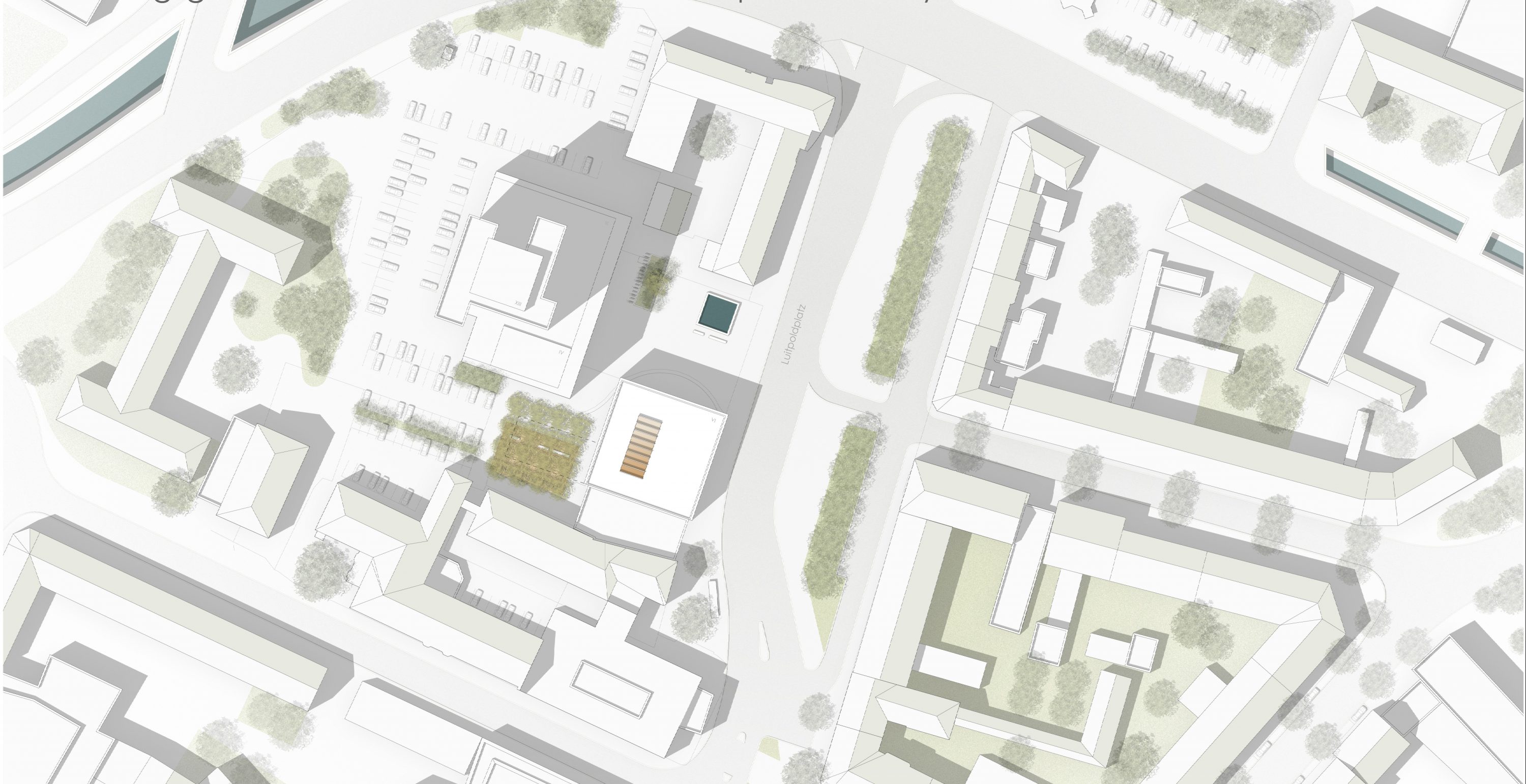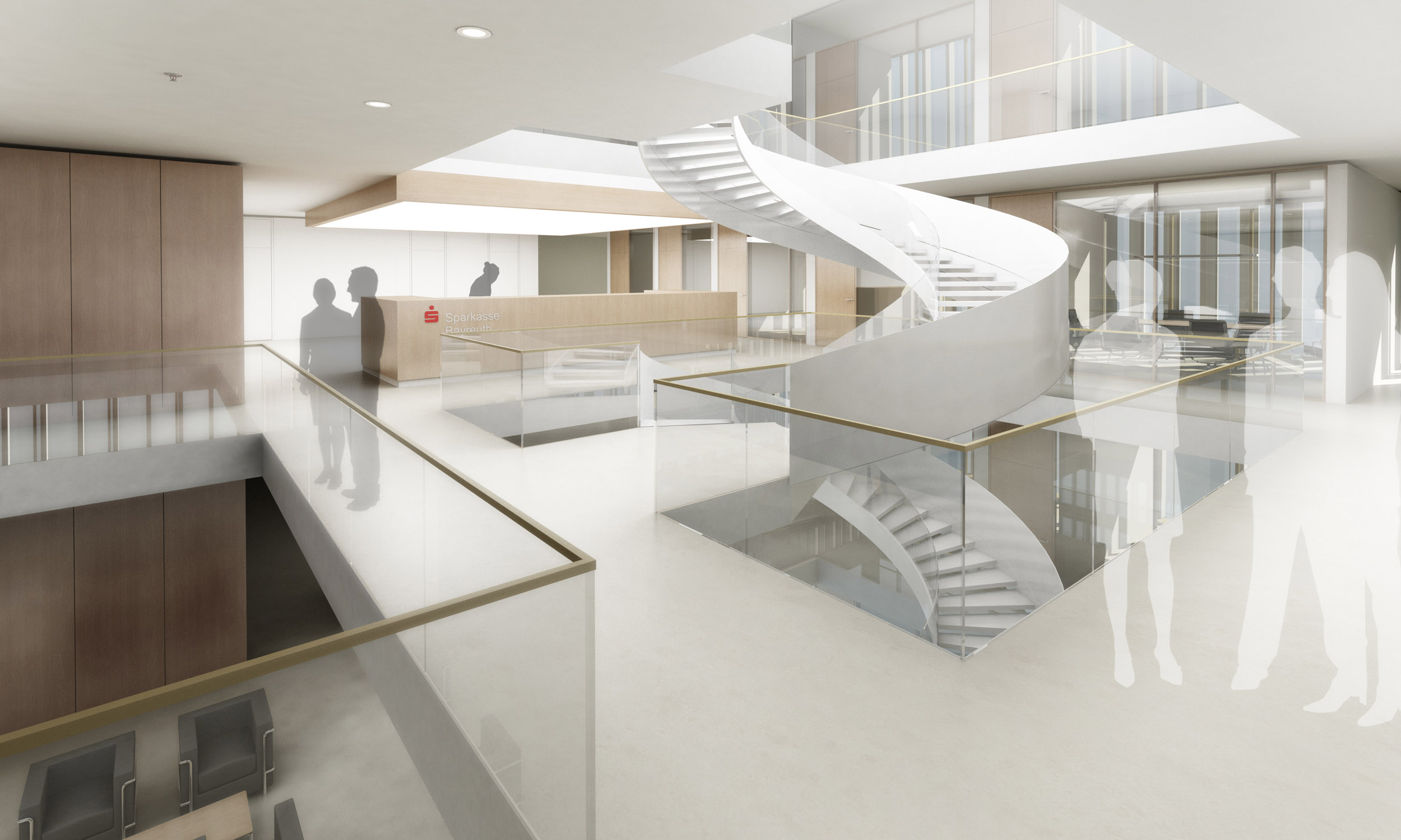 In einer Baumassenstudie wurde eine Gebäudestruktur mit Innenhof untersucht. Bedingt durch die maximale Gebäudeausdehnung von 32 m x 32 m in den Obergeschossen und einer Riegeltiefe von mind. 12 m entstünde ein Innenhof von 8,0 m x 8,0 m. Die vorgegebene Geschossigkeit betrug Erdgeschoss und 4 Obergeschosse. Eine ausreichende Belichtung der unteren Geschosse durch den zu klein dimensionierten Innenhof ist somit unmöglich. In den Eckbereichen entsteht ein hoher Anteil unbelichteter Flächen, die durch das vorgegebene Raumprogramm [viel Bürofläche, wenig Nebenfläche] unzureichend genutzt würden. Durch den südlichen Anbau des Gebäudes EON ist eine ausreichende Tagesbelichtung nur nach drei Fassadenseiten möglich. Ausgehend von dieser Situation haben wir uns entschieden, den Neubau kompakt zu halten und alle Funktionen um einen gemeinsamen Binnenraum [Atrium] zu organisieren. Dieser fördert die Kommunikation im Gebäude und ermöglicht Blickbeziehungen in andere Geschosse sowie die Kundenhalle. Die Funktionsflächen- und Bereichsverteilung wurde gegenüber den Vorgaben des Raumprogramms variiert, da die angegebenen Flächen nicht auf einer Ebene unterzubringen sind und Abweichungen von bis zu 150 m² zwischen den Ebenen vorhanden waren. Aus diesem Grund wurden zu separierende Funktionsbereiche verlagert, u.a. wurden die buchbaren Beratungsräume zusammengefasst und zwischen den beiden vorgegebenen Ebenen angeordnet.