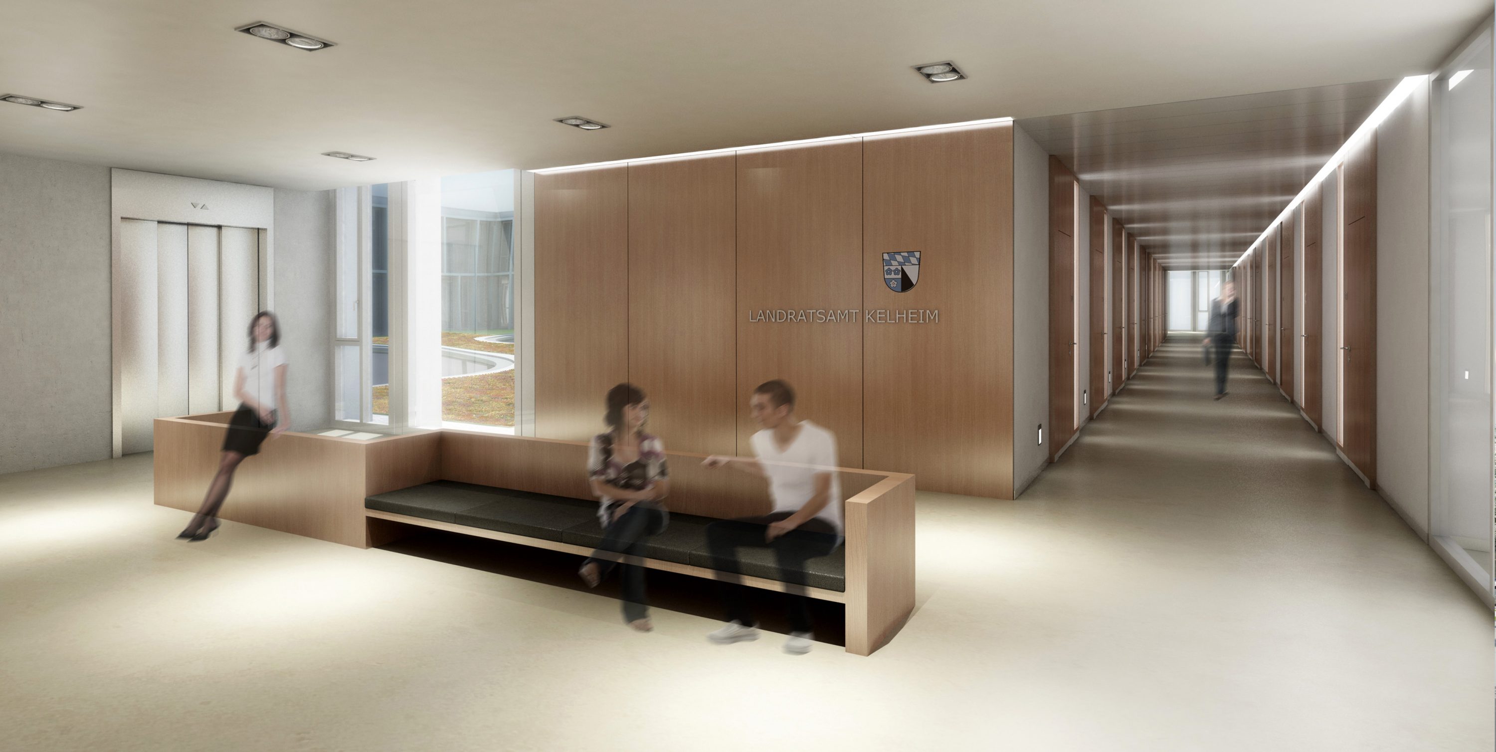 Der Nutzung entsprechend wurde ein einfaches Gebäudeprinzip gewählt. Das Innenhofgebäude mit einer Riegeltiefe von 14,10m ist als 3-Stützer konzipiert. Die vorwiegend 1 bis 2 Personenbüros werden entlang eines Mittelflurs entwickelt. An den Flurenden werden Besprechungsräume bzw. Teeküchen/Druckerports angeordnet und somit breitere Belichtungsflächen geschaffen. Die Erschließung erfolgt über 2 Vertikalkerne mit Aufzug. Die Obergeschosse sind in 4 Nutzungseinheiten aufgeteilt, die jeweils an einen Treppenhauskern bzw. die benachbarte Nutzungseinheit angeschlossen sind. Im Bereich der Aufzüge sind großzügige, tageslichtbezogene Wartebereiche angeordnet.