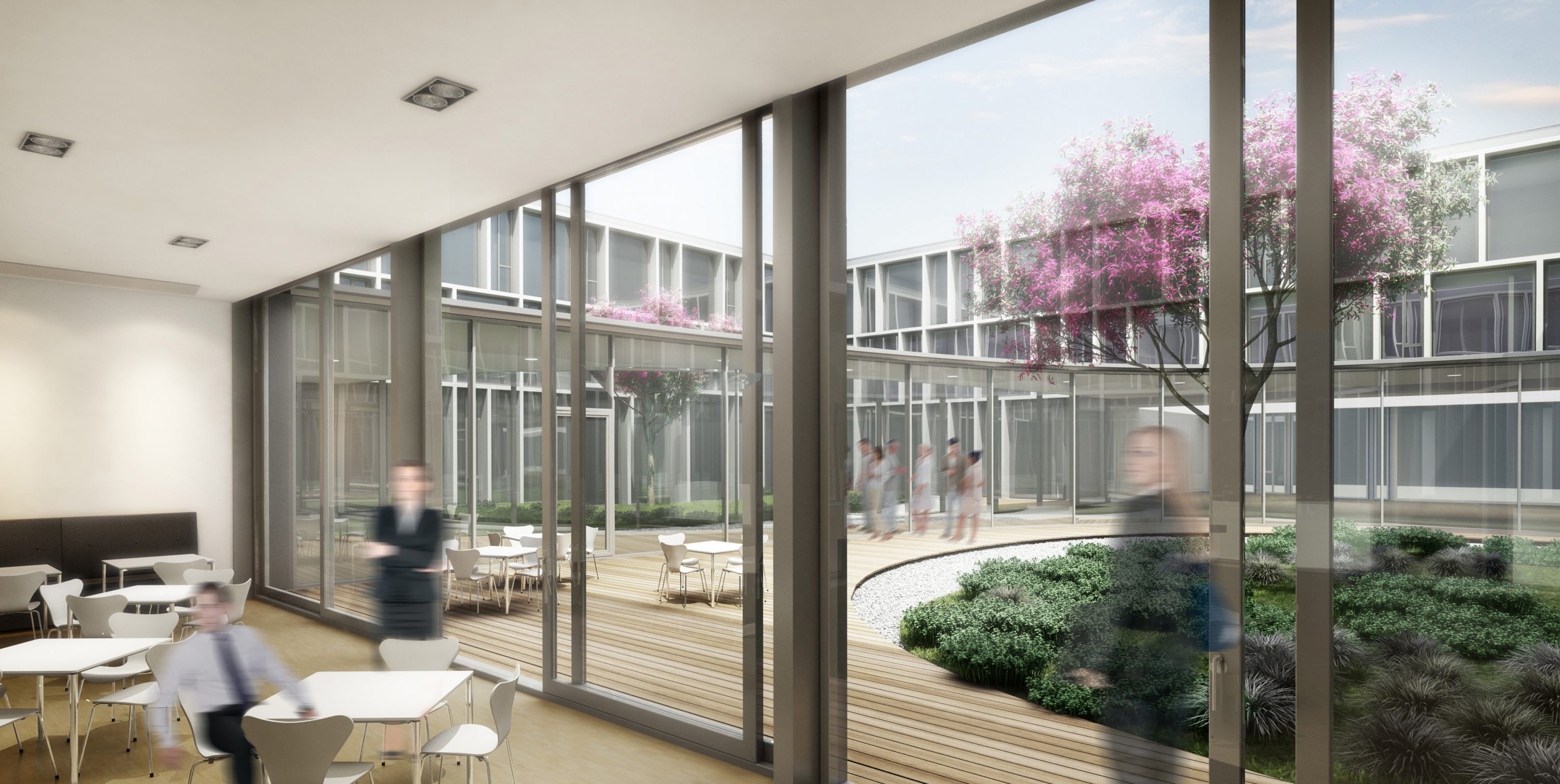 Bedingt durch das umzusetzende Raumprogramm und die zur Verfügung stehende Grundstücksfläche haben wir das Hauptaugenmerk auf die maßstäbliche Einordnung und Höhenentwicklung des Baukörpers gelegt. Die Die Gebäudeabmessungen betragen ca. 60x60m, die Dimensionierung des Innenhofes von 30x30m bei 3 Vollgeschossen ist großzügig. Die Materialität orientiert sich an Langlebigkeit und geringem Unterhaltsaufwand. Hauptgestaltungsmerkmal sind schlanke, helle Sichtbetonfertigteile, die im Konstruktionsraster des Gebäudes [1,35m] angeordnet sind. Die Ausfachungen dieser Riegelfassade erfolgen mit Festverglasungen, mit Öffnungselementen zur natürlichen Belüftung bzw. mit Glaspaneelfeldern. Der transparente Verglasungsanteil beträgt zur Gewährleistung eines hohen natürlichen Belichtungsgrades ca. 70-75%. Alle verglasten Fassadenbereiche verfügen über einen außenliegenden Sonnenschutz. Dieser ist in den horizontalen, geschoßtrennenden Sichtbetonfertigteilen integriert.