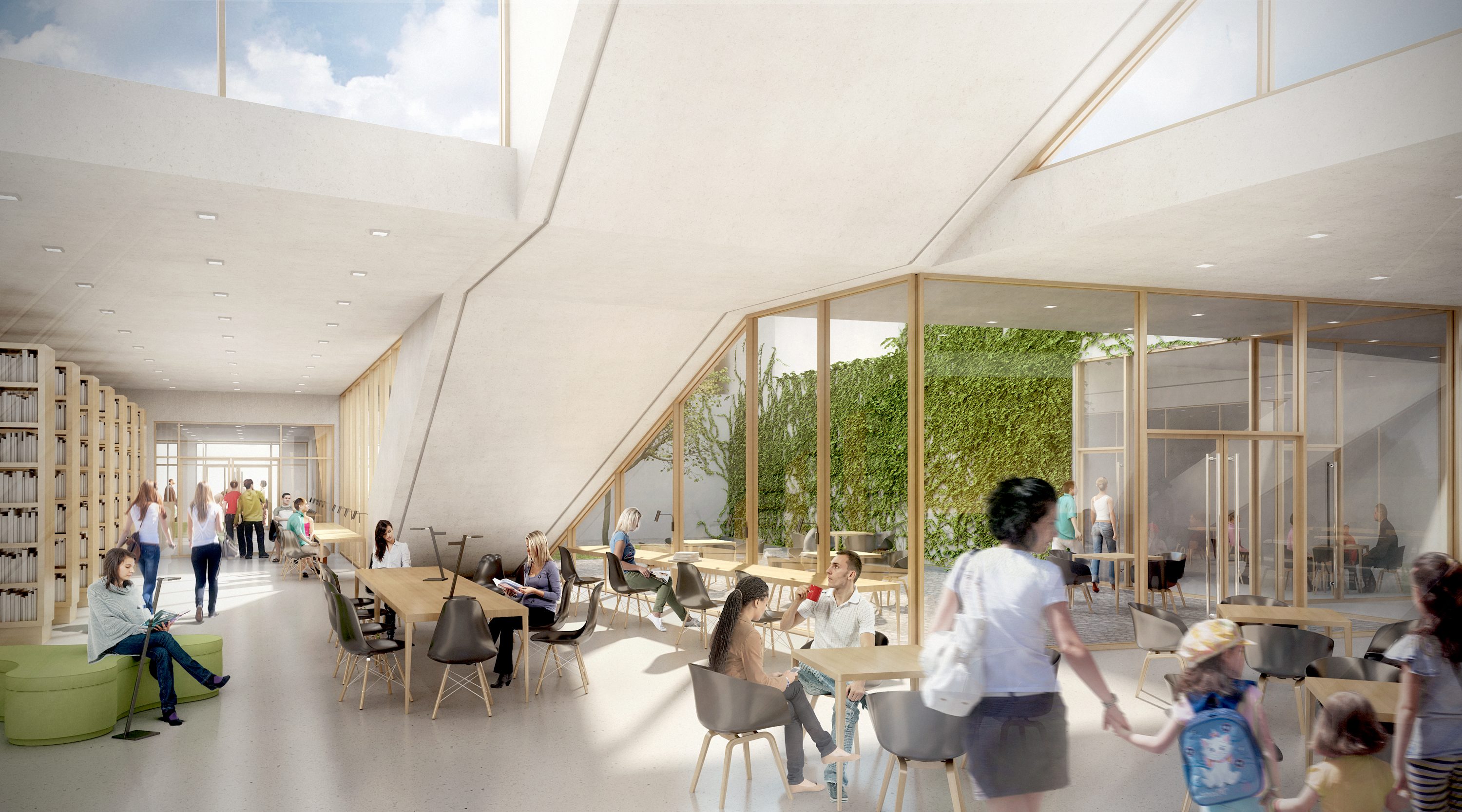 Die Fassade des Bestandsgebäudes bleibt weitestgehend unverändert und repräsentiert die neue Stadtbücherei zum Hauptmarkt. Neben dem Tor der neuen städtebaulichen Achse, positionieren sich die beiden Zugänge zu den erdgeschossigen Bereichen der Touristeninfo und dem Bibliotheksempfang. Im Bereich des Neubaus befindet sich das öffentliche Café, dass sich zum belebten Innenhof orientiert. Die Freihandbereiche der Bibliothek dienen als Bindeglied für die diversen Nutzungen und werden in Form eines offenen Raumzusammenhangs vorgeschlagen. Die angrenzenden Dunkelzonen beinhalten notwendige dienende Räume (Magazin, Nebenräume etc.) ohne Tageslichtanforderungen. In den beiden Obergeschossen des Bestands befinden sich die Verwaltungsnutzungen, die als offene Bürolandschaften abgebildet werden. Gegenüber, im neuen Anbau befindet sich der öffentliche Veranstaltungsbereich mit separatem Zugang von außen. Alle Nutzungsbereiche stehen durch Dachterrassen und die skulpturale Treppe in Verbindung.