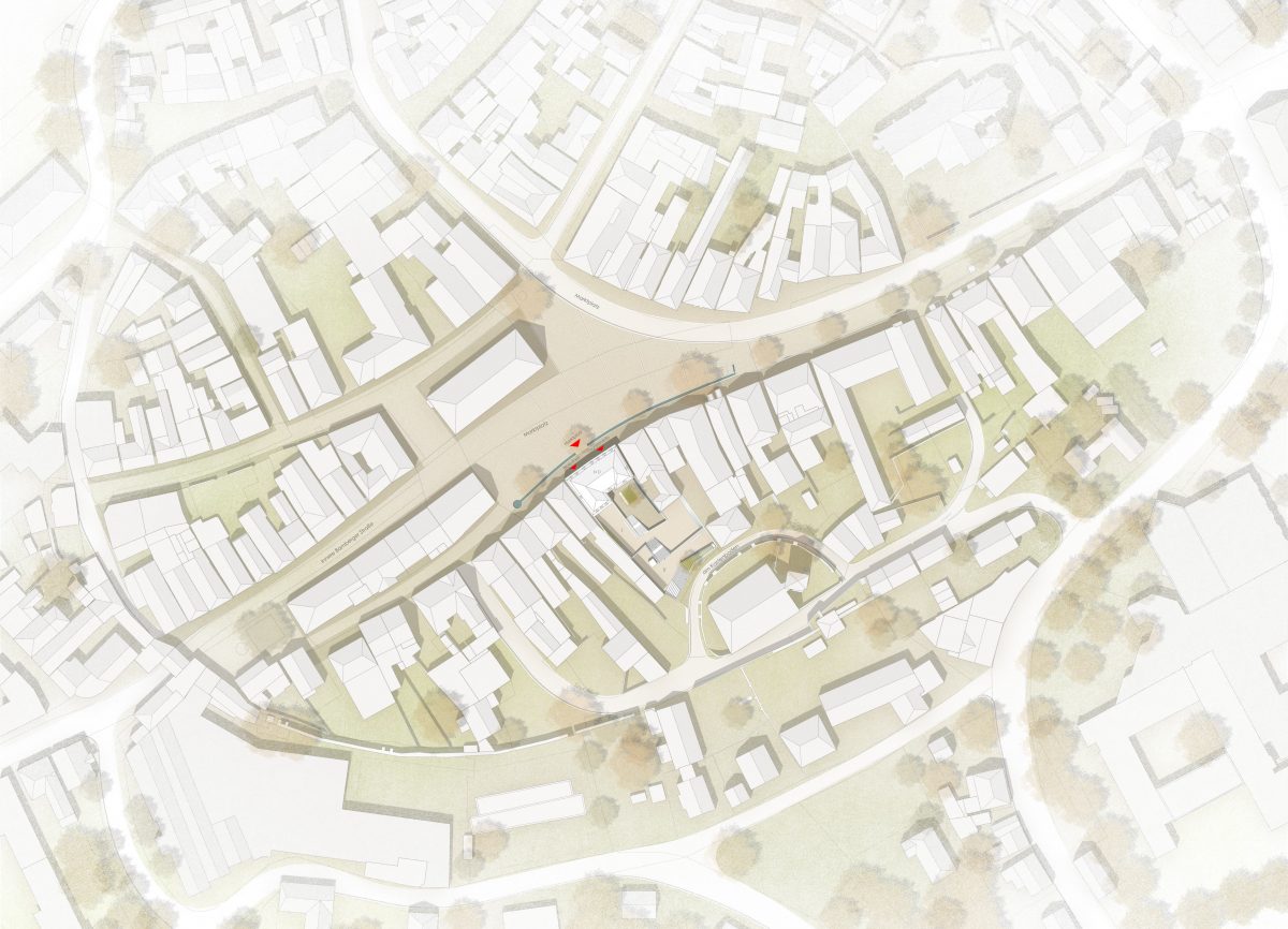 Das Grundstück liegt inmitten der Altstadt von Lichtenfels, in unmittelbarer Nähe des Marktplatzes. In der Umgebung befinden sich überwiegend historische Gebäude mit gewachsenen Nutzungen, die von Wohnen über Handel bis Gewerbe reichen. Die Stadtbücherei wird im Gebäude am Marktplatz 10 verortet und fungiert konzeptionell als städtebauliches Verbindungselement zwischen Marktplatz und Stadtschloss. Es entsteht ein harmonisches städtebauliches Ensemble, bestehend aus dem Bestandsbau am Marktplatz und einer neuen horizontalen, abgetreppten Struktur im Innenhof, die sich behutsam in den bislang introvertierten Hof legt und sich in die Höhe entwickelt, um das Höhenniveau vom Marktplatz zum Stadtschloss zu überwinden.